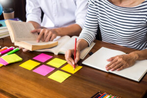 Young students classmates help friend catching up workbook and l
